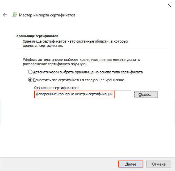 1. Выберите Доверенные корневые центры сертификации и нажмите ОК. Затем нажмите Далее.