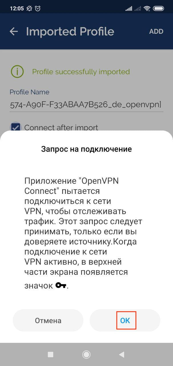 4. Если вы хотите активировать ваше VPN соединение сразу после импорта файлов конфигурации, поставьте галочку Connect after import. Нажмите Add