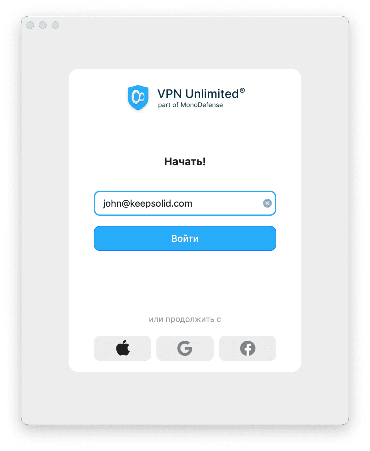 2. Если вы новый клиент сервисов KeepSolid, вы увидите следующее всплывающее окно. Нажмите кнопку Регистрация, чтобы продолжить.