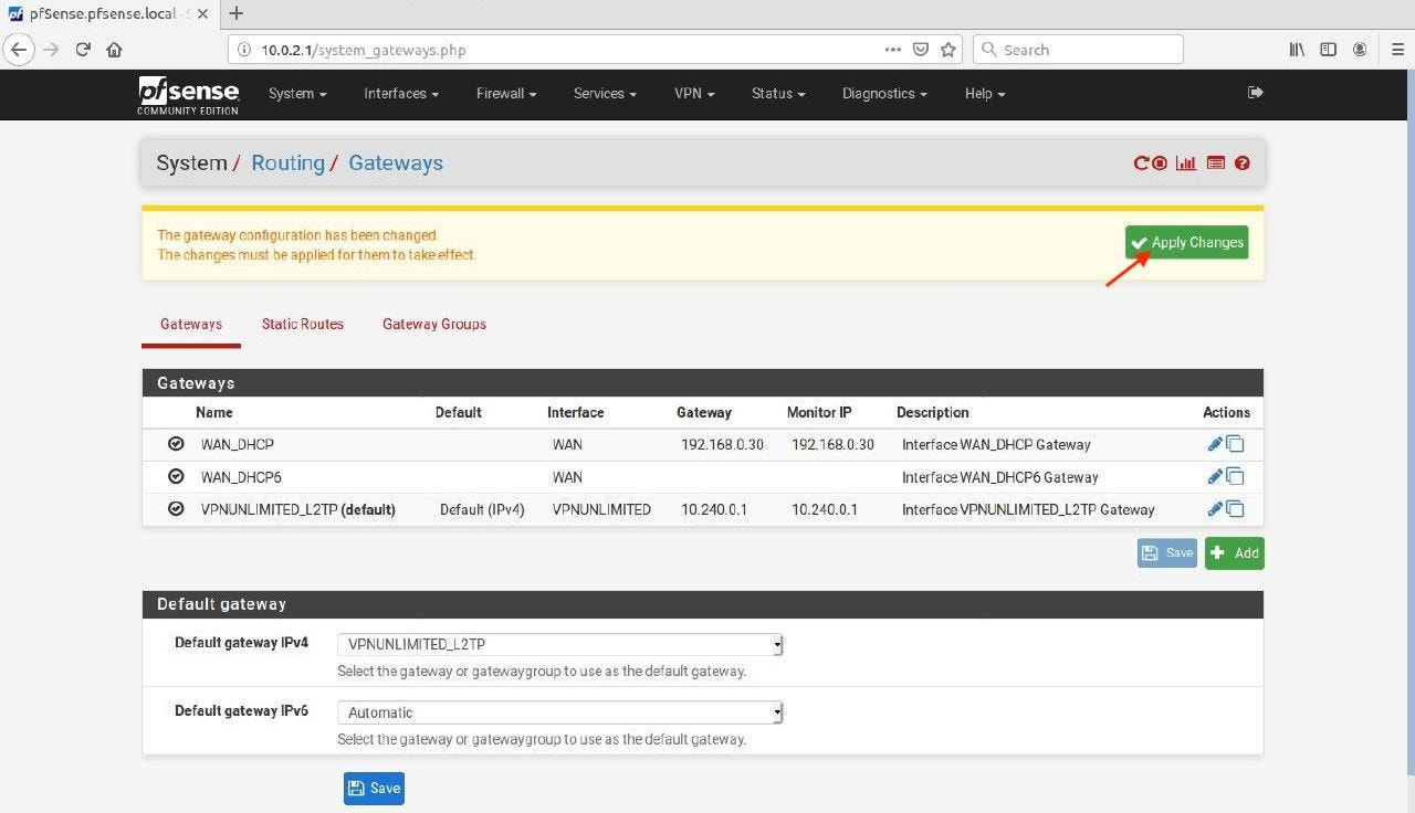 10. 前往 System(系统)选项卡 > Routing(路由),然后为 Default gateway Ipv4(默认网关 IPv4)选择 VPNUNLIMITED_L2TP 选项。