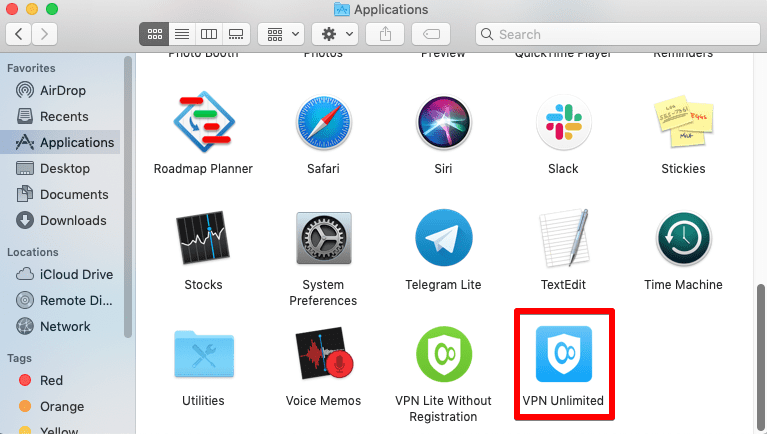 安装过程完成后,VPN Unlimited 图标将出现在 Applications(应用程序)文件夹中。