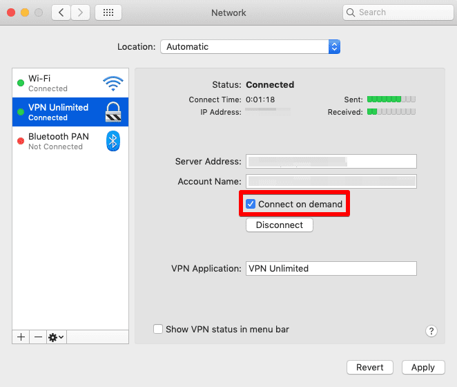 要启用或禁用 Connect on demand(按需连接),请导航到 System Preferences(系统偏好设置)> Network(网络),选择 VPN Unlimited 配置文件,然后选中或取消选中相应的复选框。