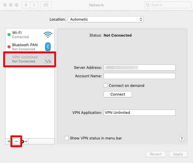 然后,进入 System Preferences(系统偏好设置)> Network(网络),选择 VPN Unlimited 配置文件,并点击删除此配置。 Button isn’t available, there is an alternative way to remove the VPN profile